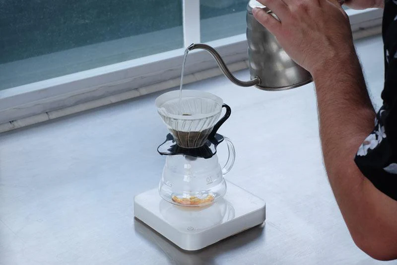 3. Bloom: Giet 50–80 gram kokend water over de koffie en roer zachtjes. Laat de koffie 30–40 seconden bloeien zodat CO₂ kan ontsnappen.